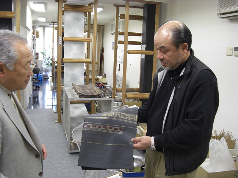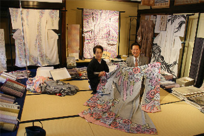 ながもとの着物は京都の契約工房で製作します。作家の先生とデザインや 色彩の打ち合わせ。